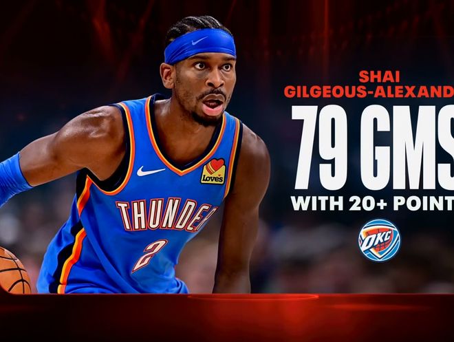 • 历史第三!亚历山大连80场20+太稳 8战7场30+冲得分王+MVP