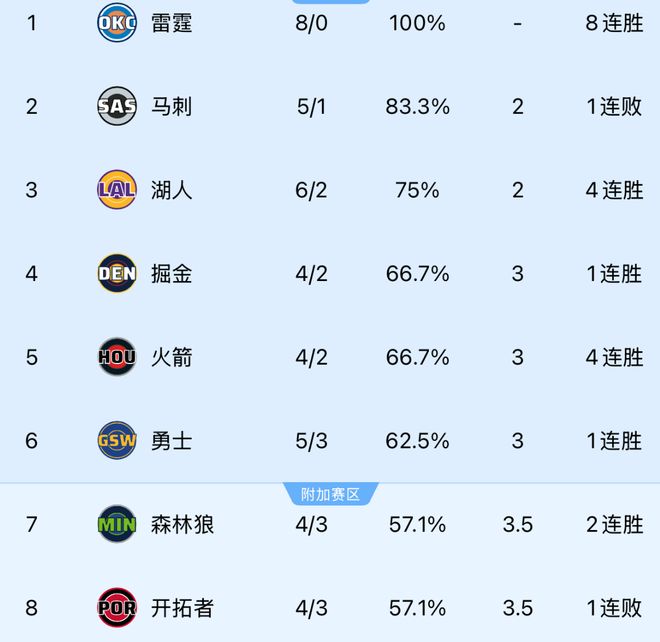 随着雷霆8连胜创纪录,勇士赢太阳,西部最新排行:快船跌至第10